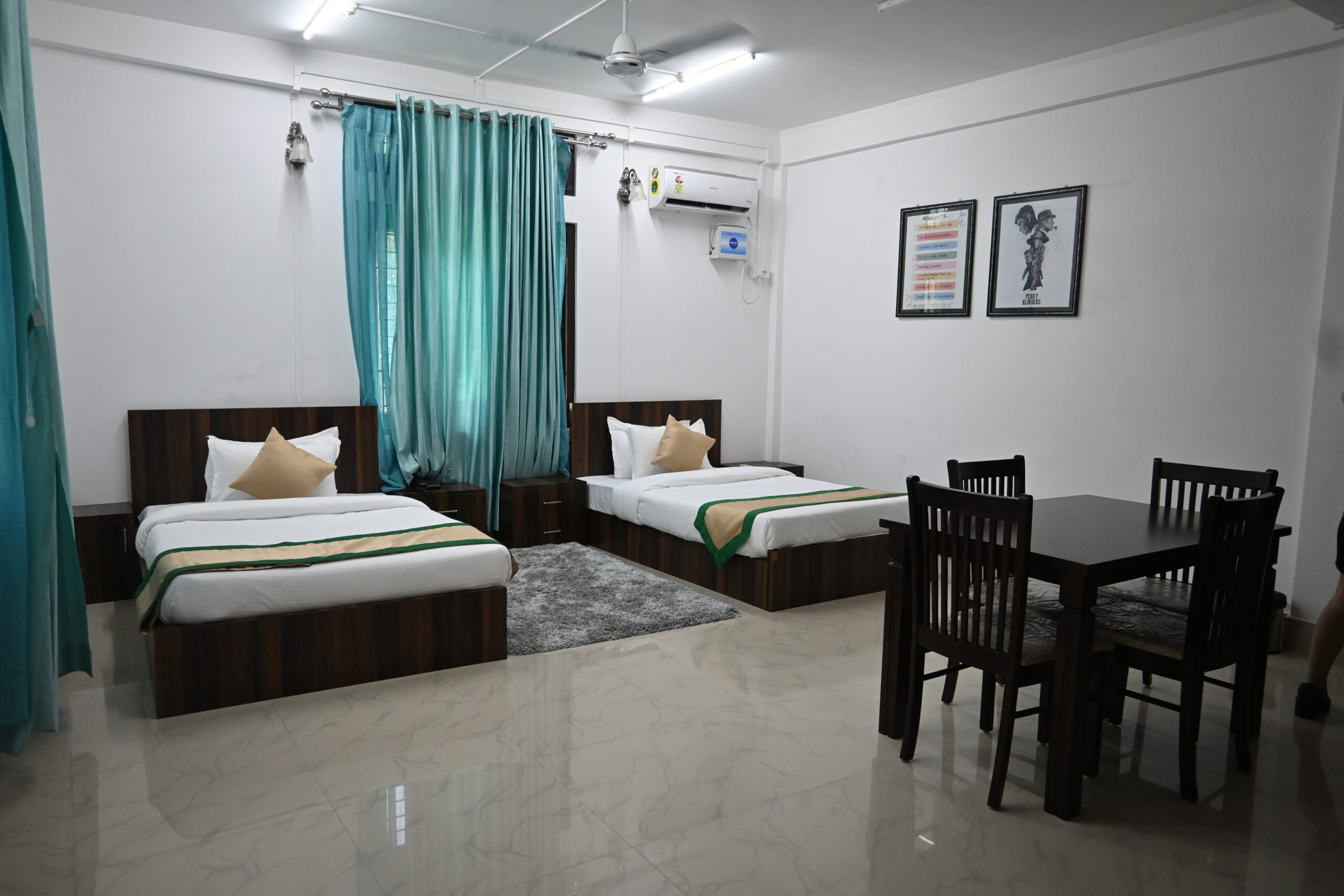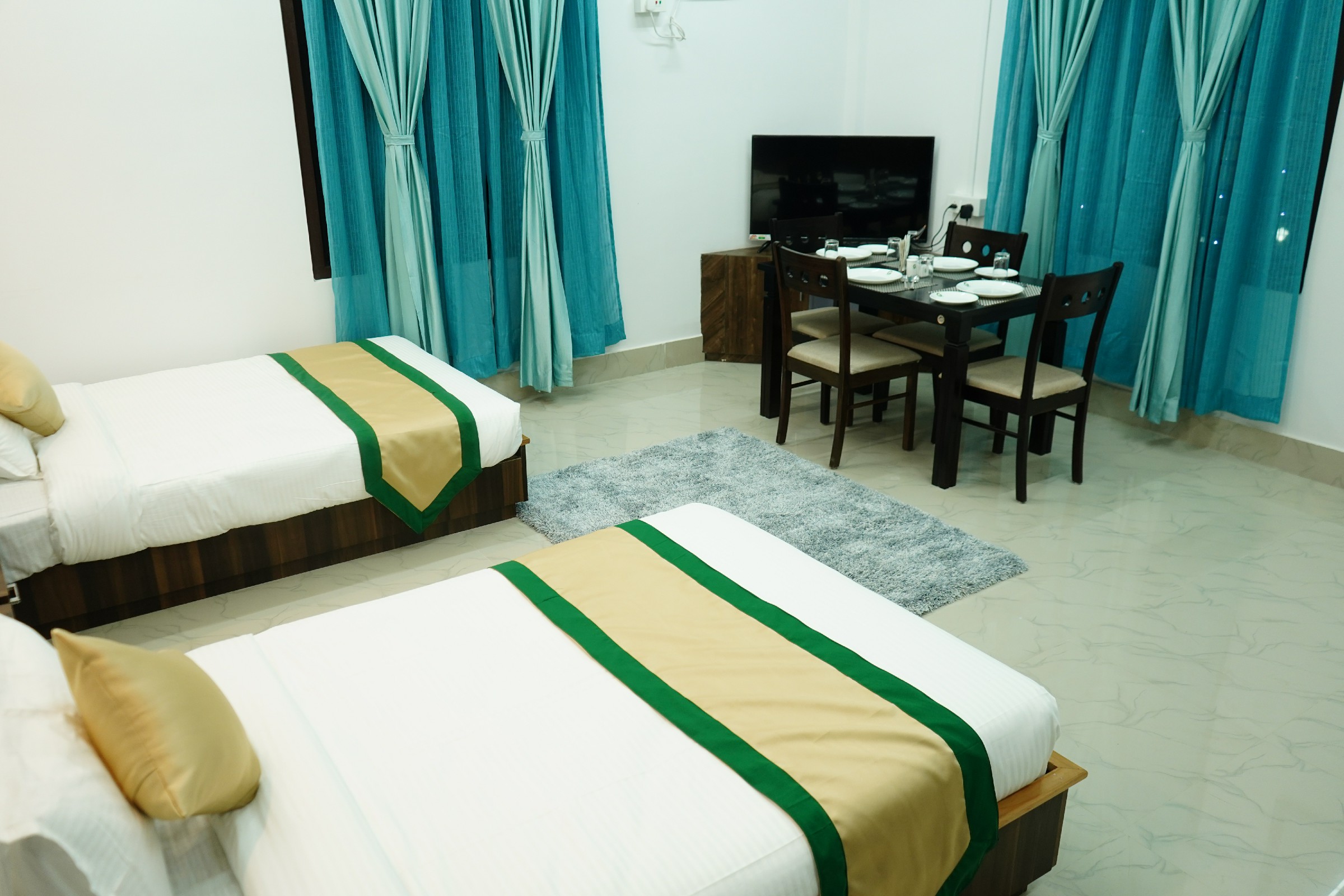 The room also features a private dining table for guests to enjoy their meals in the comfort of their own room. The table is perfect for intimate dinners or for those who prefer to dine in privacy.