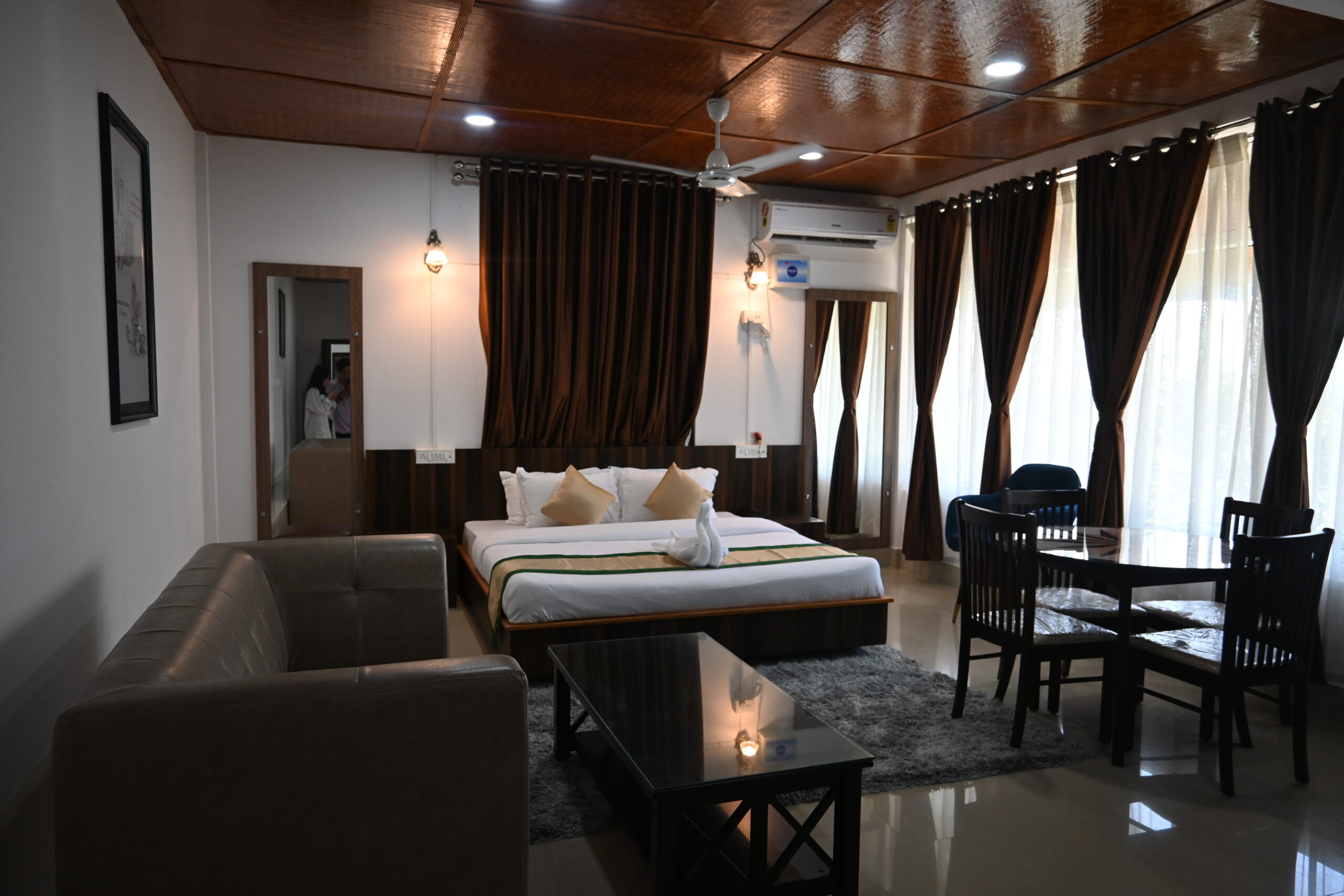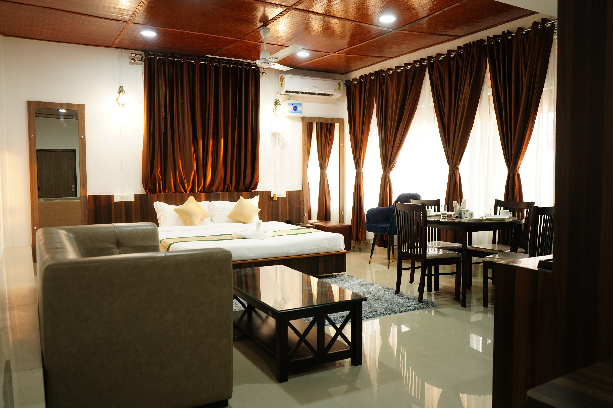 The room also features a private dining table for guests to enjoy their meals in the comfort of their own room. The table is perfect for intimate dinners or for those who prefer to dine in privacy.